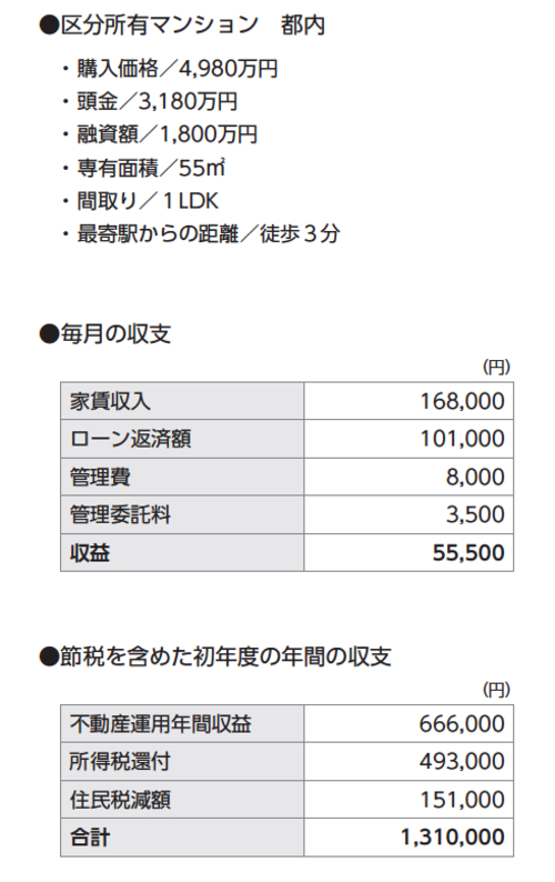 たとえ1室といえども新築マンションを購入すれば、収益で年間60万円以上、さらに節税でも60万円以上の合計約130万円の収益が見込めるのです。