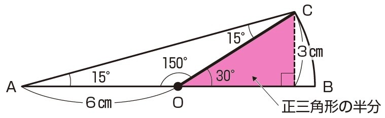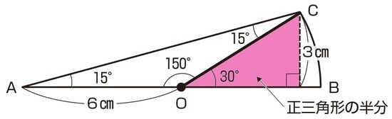 150°の外角が30°なので、正三角形の半分の形が隠れています。OA=OC=6cmより、OAを底辺とした時の高さは、30°・60°・90°の直角三角形の長さの比が2:1であることから、3cmになります。