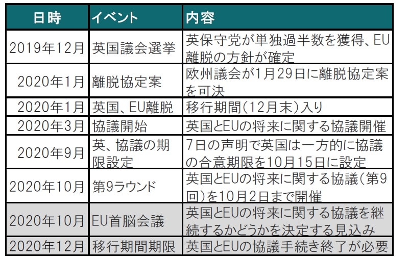 まず、英国のEU離脱に関連するイベントを振り返ると、昨年の英国議会選挙でEU離脱を支持する保守党が勝利したことで、英国のEU離脱の方針は確定され、今年3月からの英国とEUとの協議では離脱後の姿が協議されています。