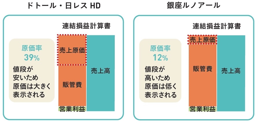 実際に損益計算書(P/L)を見てみると、ドトールの原価率が39%なのに対し、ルノアールの原価率は12%しかありません(図表4)。原価率の違いは、単価によって生じているもので、単価はそれぞれがどこまでのサービスを顧客に提供するか等の販売戦略によって異なるということがわかります。
