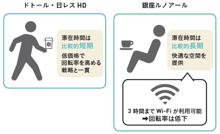 このように、同じカフェでも様々なものが異なります。ここから読み取れることは、「ドトールは顧客の長期滞在を前提とせず、たくさんの顧客に商品を購入してもらうという戦略なんだな」ということです。これを、一般に「回転率が高い」と表現します。