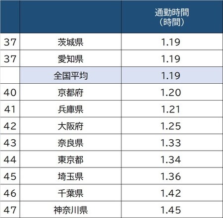 睡眠時間の短さのについては、いくつかの原因が言われていますが、そのひとつが「通勤時間」。同調査では都道府県別に通勤平均時間を明らかにしていますが、最も長いのが「神奈川県」で1.45時間。「千葉県」1.42時間、「埼玉県」1.36時間と、ここでも東京周辺の3県がワースト3。「東京都」もワースト4に続いています(図表2)。