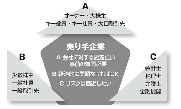 買い手もこの点は最も懸念することであり、売り手としては、あくまで買収後に支障をきたすステークホルダーには反対を受けないよう最大限の配慮が求められる。ただし、「事前に」ということは、M&A情報が漏えいし、破談リスクも高まるので、経験あるM&Aアドバイザーのアドバイスを受けながら、慎重に進めなくてはならない。売り手のステークホルダーの心理面もよく理解して対応しておくことが大事だ(図表)。