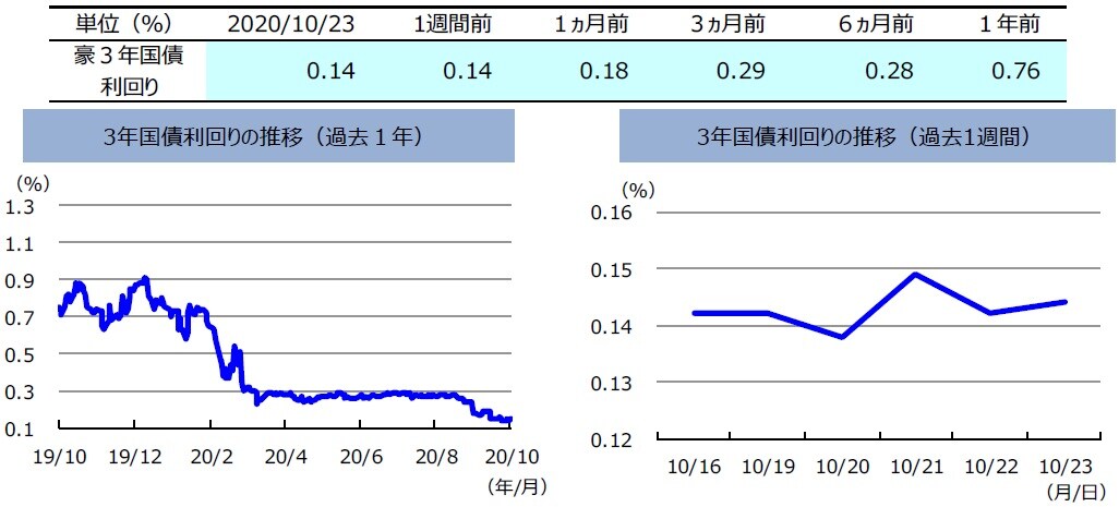 先週の豪州3年国債利回りは、若干上昇しました。豪州準備銀行(RBA)会合議事要旨発表やRBAケント総裁補のハト派的な発言により追加緩和期待が高まったことにより豪州3年国債利回りは低下したものの、米国の追加経済対策成立への期待感などから主要国金利が上昇したことに連られて豪州3年国債利回りも上昇しました。週間を通しては、豪州3年国債利回りは若干上昇(国債価格は下落)しました。
