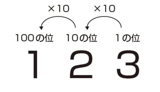十進法では、0を含めて10種類の記号が必要となります。十進法で「123」と表すと、「100の位」が1、「10の位」が2、「1の位」が3というように考えますよね。
