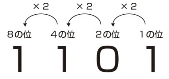 二進法では、2個集まると次の位になるので、下の位から順に1の位、2の位、4の位、8の位となります。