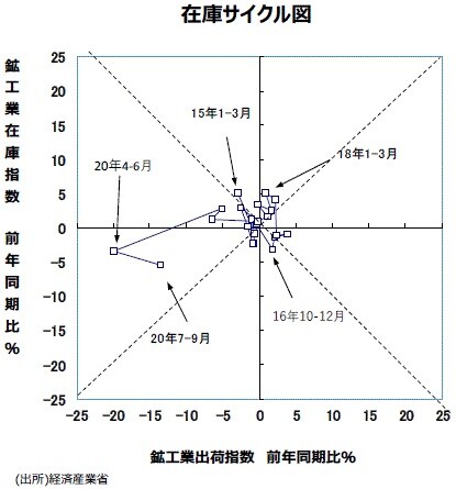 ●大きな動きをチェックするために、鉱工業全体で縦軸に在庫の前年比を、横軸に出荷の前年比をとった在庫サイクル図をつくると、17年10~12月期以降、45度線を上回って推移し、概ね「在庫積み上がり局面」が続いていた。19年10~12月期、出荷の前年同期比が▲6.5%、在庫が同+1.2%、20年1~3月期、出荷の前年同期比が▲5.2%、在庫が同+2.9%と、どちらも「在庫調整局面」であった。20年4~6月期は、出荷の前年同月比が▲19.9%、在庫が同▲3.4%と、出荷は大幅に減少したものの在庫調整がさらに進んだ。20年7~9月期は、出荷の前年同月比が▲13.5%、在庫が同▲5.5%と、引き続き「在庫調整局面」の状態にあるが、在庫調整は進みつつあると言えよう。