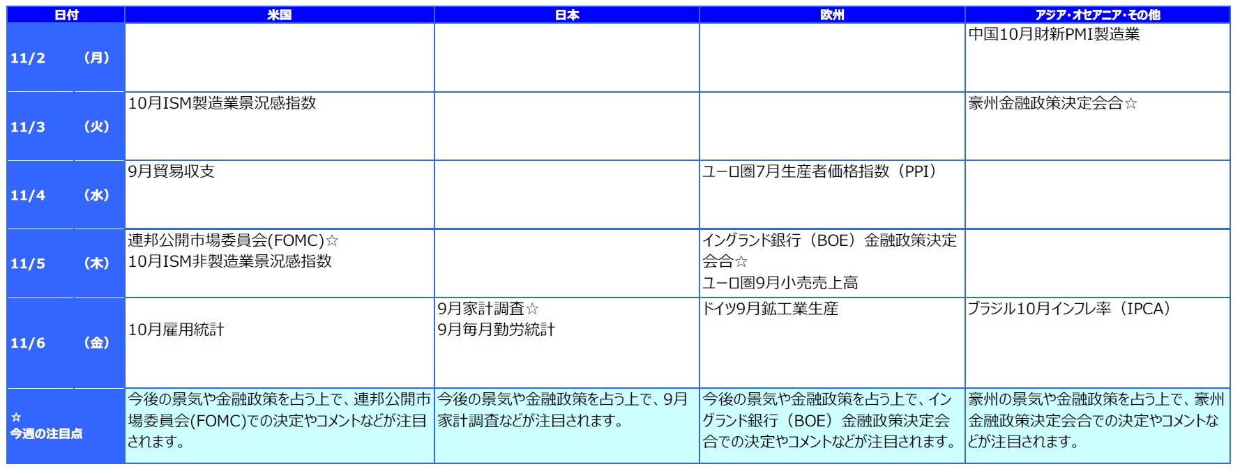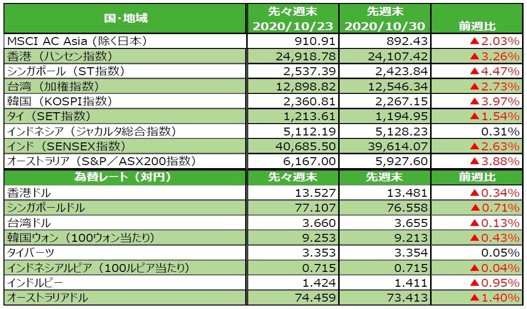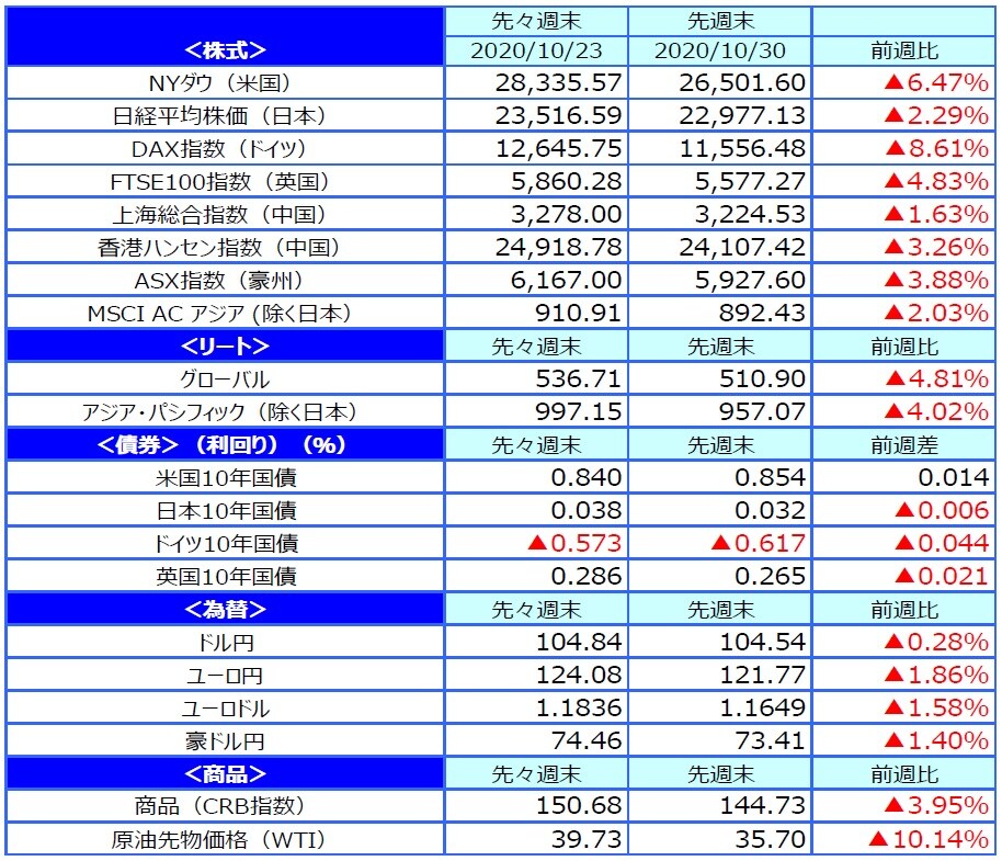 主要株式市場は下落しました。米国株式市場では、米国で新型コロナ新規感染者数が過去最高を更新したことや、追加経済対策を巡る与野党協議が難航したこと、依然として大統領選挙を巡る不透明感が続いていることなどが嫌気されました。NYダウは週間では6.47%下落しました。日本株式市場は、発表が始まった7-9月期の企業業績は、良好な企業もありますが、世界的な新型コロナの感染拡大などによる欧米株安などを嫌気して下落しました。週間では2.29%下落しました。欧州株式市場は、欧州での新型コロナの感染急拡大に伴うフランスやドイツなど各国の制限措置の実施による景気悪化懸念などが嫌気されました。DAX指数は8.61%、FTSE100指数は4.83%下落しました。中国株式市場は、欧米での新型コロナの感染急拡大や、米大統領選挙を控え様子見が強まり上海総合指数は1.63%下落、香港ハンセン指数は3.26%下落しました。
