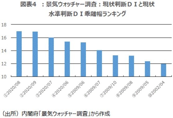 現状判断DIと現状水準判断DIはともに持ち直してはいるものの、その乖離は6月に15.4と、リーマンショックからの持ち直し時期で過去最大だった2009年6月の15.3を上回った。その後2020年7月16.0、8月17.0、9月16.9と最大水準で推移している。水準は低いものの、方向的には改善傾向が続いていることを示唆する数字だと考えられよう。景気の水準が大きく落ち込んだ後の景気拡張局面の初期にみられる現象だが、現在リーマンショック時直後を上回る大きな乖離幅となっている(図表4)。