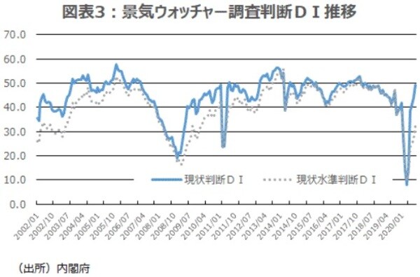 毎月25日から月末を調査期間として、景気に敏感な立場にいる人々の意見を聞く「景気ウォッチャー調査」では、足元の景気の方向性(良くなる・悪くなる)を示す現状判断DIは、新型コロナウイルス感染症対策で緊急事態宣言が発動された4月に7.9と史上最低を記録した。その後、持ち直し5月15.5、6月38.8、7月41.1、8月43.9と上昇し、9月では49.3と、全員が「変わらない」と答えた場合の50に接近した。一方、足元の景気の水準(良い・悪い)を示す現状水準判断DIは、4月に9.8とこちらも過去最低だった。こちらもその後は持ち直し5月12.7、6月23.4、7月25.1、8月26.9、9月32.4となった。ただし、全員が「やや悪い」と答えた場合の25を少し上回る水準に留まっている(図表3)。