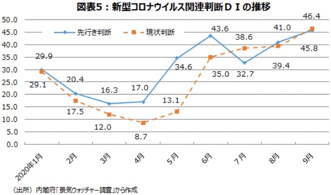 新型コロナウイルスに関するコメントをした景気ウォッチャーの回答だけを使い、新型コロナウイルス関連・現状判断DIと、先行き判断DIを独自に作成すると、新型コロナウイルス関連・現状判断DIは4月には8.7と3月の12.0から1ケタに下落したが、5月13.1、6月35.0、7月38.6、8月39.4、9月46.4に戻した。一方、新型コロナウイルス関連・先行き判断DIは、いち早く底打ち感が出ていた。3月の16.3を底に6月は43.6へ上昇したが、感染者増加の第2波の時期に先行き懸念が台頭し、7月は32.7に低下してしまった。その後持ち直し、8月41.0、9月45.8に戻した(図表5)。