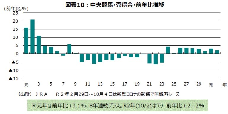 JRA(中央競馬会)の今年の売得金・年初からの累計金額の前年比は新型コロナウイルスの影響で5月3日の週までの累計で▲6.2%まで悪化した。しかし、そこから改善し、10月25日までの週の累計では前年比+2.2%と増加になっている(図表10)。10月25日に行われた菊花賞では一番人気のコントレイルが見事に勝利し、父ディープインパクト以来となる無敗の3冠馬に輝いた。菊花賞の売得金の前年比は+30.4%と前週開催されたG1レース秋華賞の同+40.1%に続き2レース連続して2ケタの増加になった。