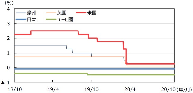 米連邦準備制度理事会(FRB)は大規模金融緩和政策を継続し、ゼロ金利政策を維持しています。9月の米連邦公開市場委員会(FOMC)でフォワード・ガイダンスを導入し、2%の平均インフレ目標の達成を政策金利変更の要件としました。欧州中央銀行(ECB)も金融緩和策を維持しており、10月の理事会では金融政策をいずれも据え置きました。但し、経済見通しのリスクは明確にダウンサイドに傾いたとし、今後の新型コロナ感染再拡大と規制の影響を踏まえ、12月に経済見通し改訂と追加緩和を強く示唆しました。日銀は3月以降、新型コロナ対策として資産買入れ強化、企業金融支援、企業等の資金繰り支援策を拡大する一方、金融政策は6月以降据え置いています。