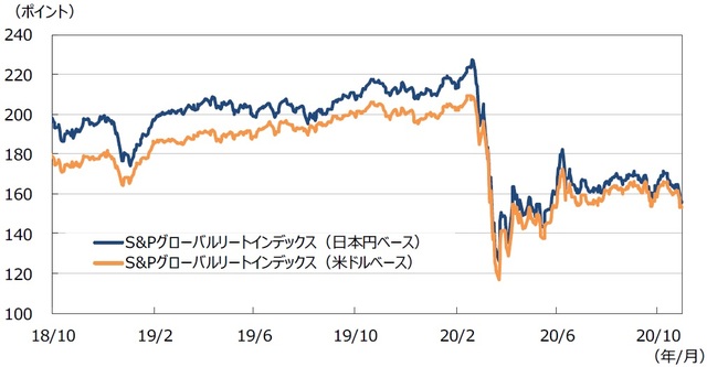 グローバルリート市場は上値の重い展開を想定します。米国ではロックダウン解除から景気が急回復しましたが、足元は緩やかな回復に留まっています。但し製造業の回復は顕著で、ワクチンの開発・浸透や大統領選後の財政政策次第で景気回復が再度加熱する可能性があります。欧州でも緩慢な景気回復が予想されますが、新型コロナの感染再拡大が深刻化しているため回復スピードは想定より遅くなるとみられます。Eコマースの浸透を受けたファッションブランド企業の破綻や都市部賃料の下落など、構造変化の顕在化は続くと予想されます。また、コロナ禍で悪影響を受けているオフィスセクターと、安定的な業績を達成している物流施設セクターなど、セクター間の格差も続くと予想されます。低金利環境の継続からインカム商品が再着目されるとみられることや、大統領選への不透明感が払しょくされることなどが市場をサポートすることが期待されますが、景気回復期待の強まりやインフレを受けた急な長期金利の上昇はリートに向かい風となるため注意が必要です。