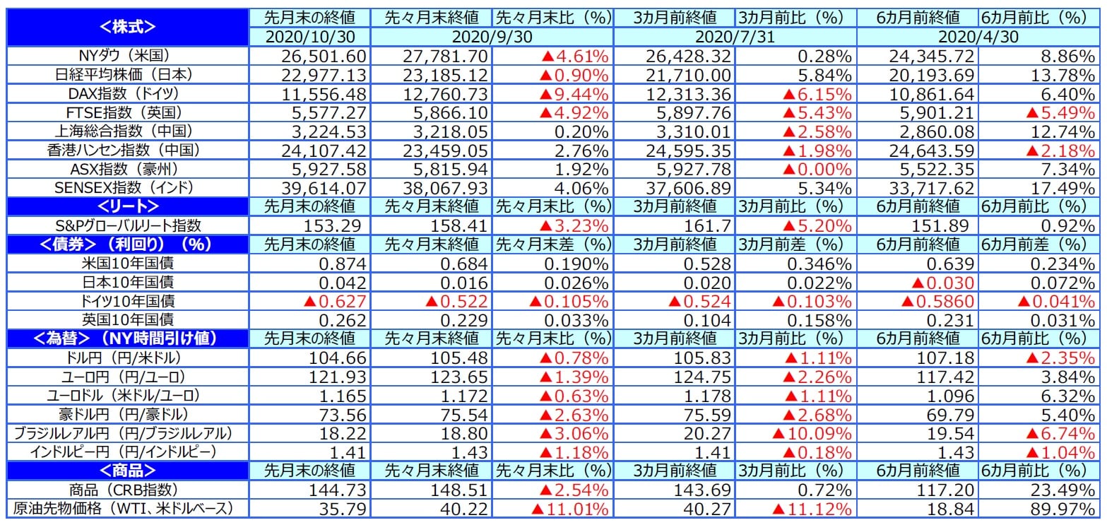 10月の株式市場は、米欧などの先進国市場が下落する一方で、アジア市場は比較的底堅い動きとなりました。米国市場は、11月の大統領選挙を控え神経質な動きとなり、新型コロナ感染再拡大や追加経済対策の後ずれも嫌気され、月末にかけて下落しました。欧州では新型コロナの感染再拡大が深刻化しました。各国で行動制限の強化や一部で都市封鎖が再開され、景気の先行き懸念が強まったことから欧州市場は下落しました。日経平均株価は月末にかけて米大統領選を控えた様子見姿勢が広がり、やや下落しました。インド株市場は、中長期的な経済成長期待を背景に海外からの投資資金の流入が続き上昇しました。
