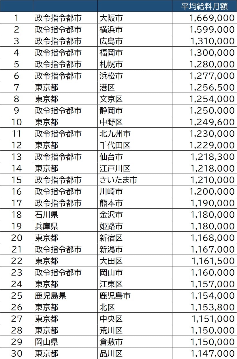 政令指定都市と東京特別区以外で最も上位なのが「石川県金沢市」と「兵庫県姫路市」で118万円。以降、指定都市と特別区以外で、「鹿児島県鹿児島市」「岡山県倉敷市」がトッ30に入りました。