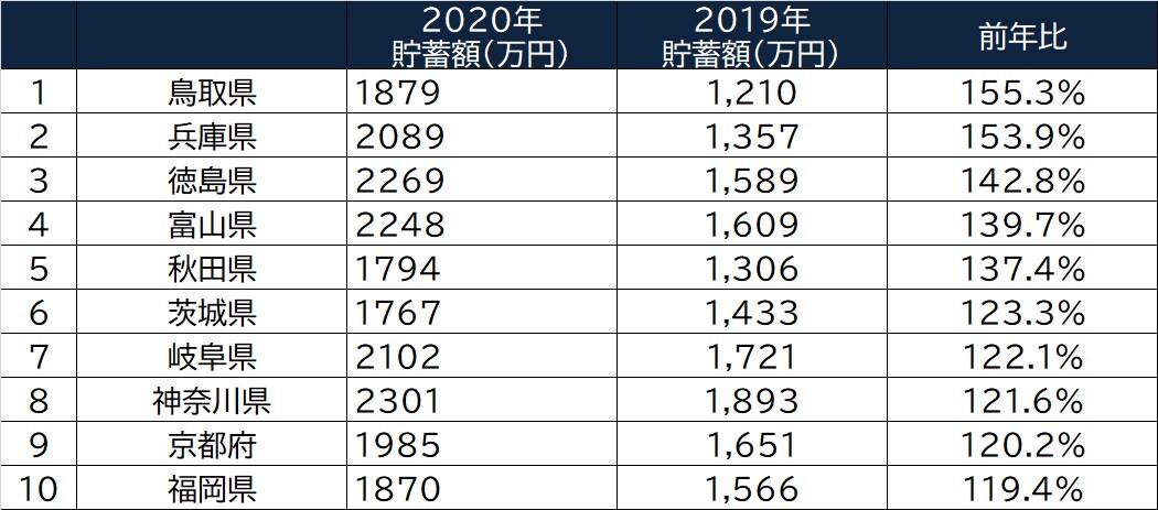 次に「貯蓄」についてもみていきましょう。全都道府県平均は前年比100.2%と、2020年4~6月時点では全国的に貯蓄が増えているという状況です。そのなかで最も貯蓄額の増え方が大きいのが「鳥取県」で155.3%。「兵庫県」153.9%、「徳島県」142.8%、「富山県」139.7%、「秋田県」137.4%と続きます。「徳島県」は収入減でワースト2にラインクインしたのにも関わらず、貯蓄額の上げ幅では上位にランクイン。危機的状況下のなかでも、しっかりと貯蓄を増やしていくという、やりくり上手な一面が垣間見られます(図表4)。
