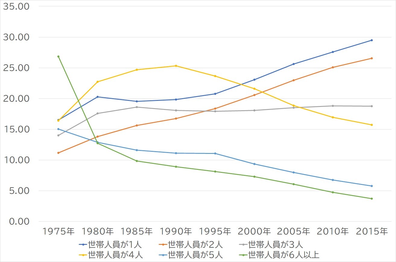 しかし1975年、1世帯当たりの構成人数は4.14人だったのが、2015年には2.15人へと減少。全世帯のなかで、1人世帯や2人世帯は増加の一途を辿るのに対し、3人世帯は1980年代からほぼ横ばい、1995年ごろまで最も割合の多い構成帯だった4人世帯は減少し、5人以上の世帯は1割を切るほど、珍しい家族になっています(図表1)。