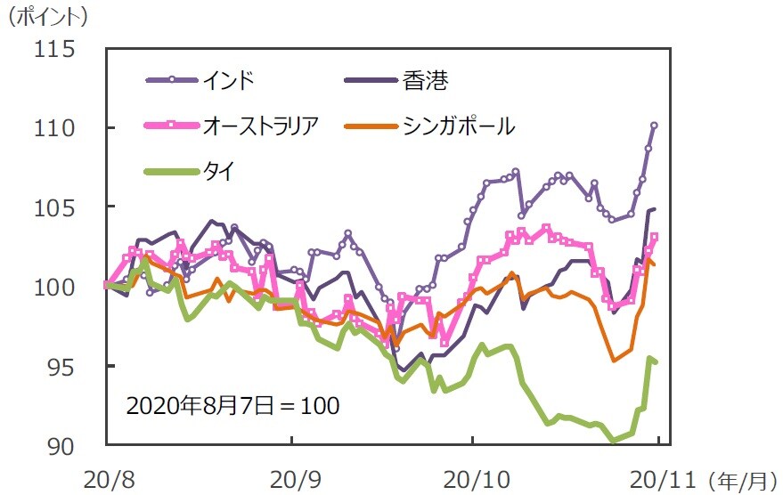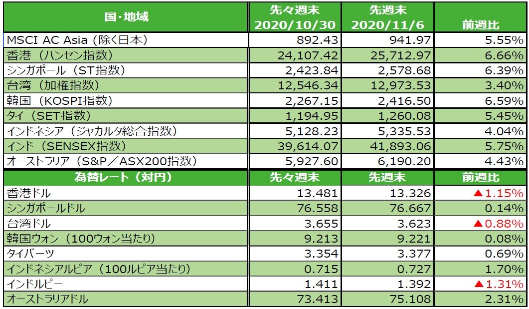 主要株式市場は米国大統領選挙でのバイデン氏優位などを受けて大幅に上昇しました。米国株式市場では、大統領選でバイデン氏優位となるとともに民主党が大統領選と上下院の両方で勝利する「ブルーウェーブ」の可能性が低下したことで、法人増税、IT企業への規制強化などへの懸念が後退したことなどが好感されました。NYダウは週間では6.87%上昇しました。日本株式市場は、円高となったもののバイデン氏の優勢を織り込む格好で、米国株が大幅上昇したことなどを受けて、日経平均株価は29年ぶりの高値を更新しました。週間では5.87%上昇しました。欧州株式市場は、欧州各国の好調な製造業PMIが好感されたほか、米国で民主党政権誕生による通商関係改善期待や米国株高が好感されました。DAX指数は7.99%、FTSE100指数は5.97%上昇しました。中国株式市場は、10月の中国製造業PMIや欧米株高を好感して上海総合指数は2.72%上昇、香港ハンセン指数は6.66%上昇しました。