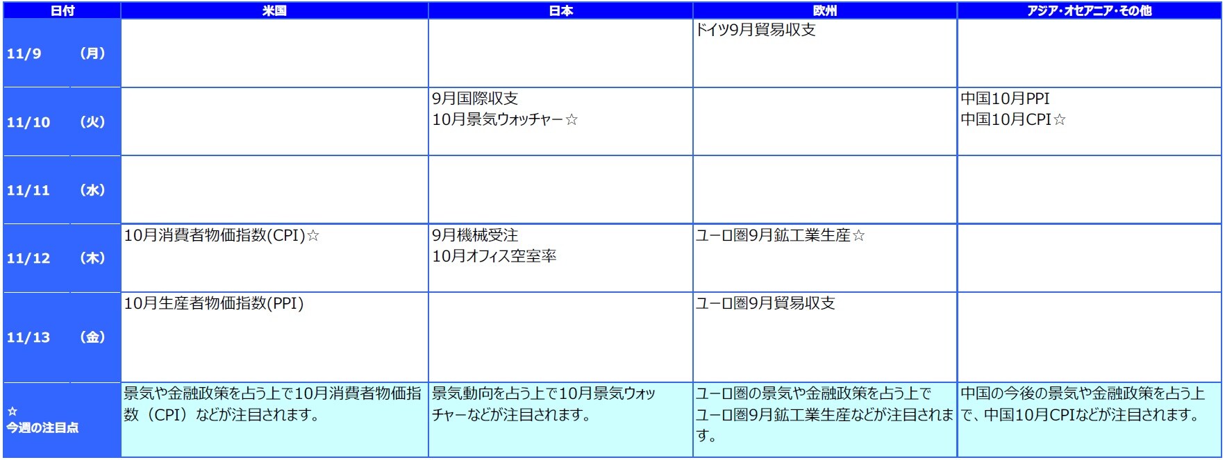 米国の債券市場は、上院は共和党優勢と報じられる中で、ねじれ議会は続き、財政支出の大幅拡大が後退したことやADP雇用統計の軟調な結果を背景に、長期金利は0.038%低下しました。ドイツ、英国の長期金利は上昇、日本は低下しました。