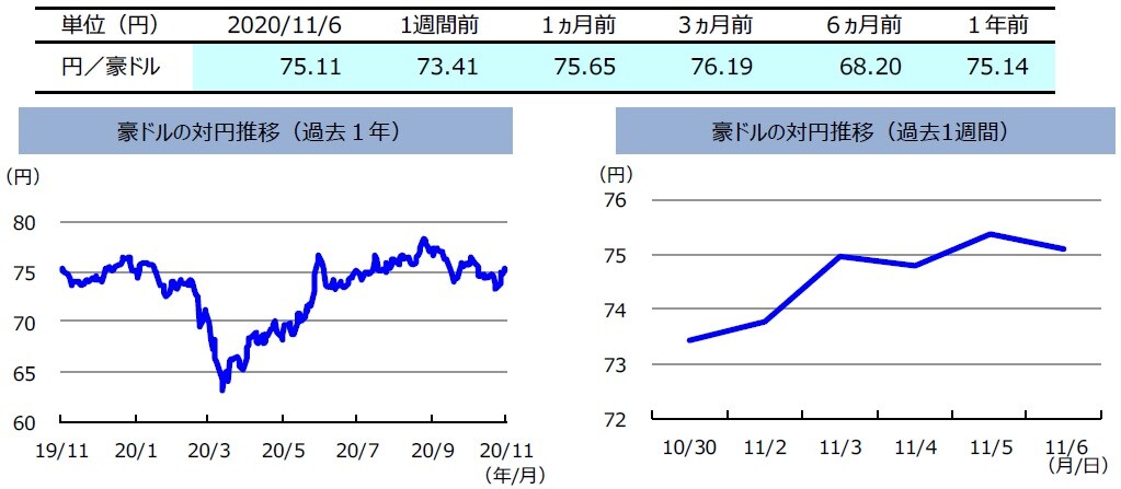 先週の豪ドルの対円レートは大幅に上昇しました。週前半、豪州準備銀行(RBA)の大規模な追加緩和決定により、一層の緩和期待が後退したことなどから豪ドルが買われました。週後半にかけて、米国の議会選挙で上下院がねじれ議会となる可能性が高まり、規制強化などの懸念が後退したことを背景にリスク選好の動きとなり、景気に敏感とされる資源国通貨である豪ドルが買われ、週間を通して、豪ドルの対円レートは大幅に上昇しました。