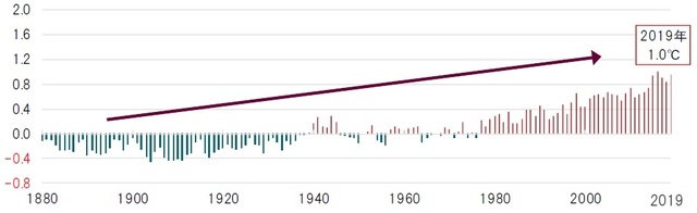 世界の平均気温は上昇している。NOAA(米国海洋大気庁)によれば、世界の平均気温偏差(20世紀の平均気温からの乖離)は年々上昇傾向にあり、2019年は1℃を記録した(図表1)。大きな変化だとは思われないかもしれないが、1988年にUNEP(国連環境計画)と世界気象機関(WMO)により設立されたIPCC(国連気候変動に関する政府間パネル)の第5次評価報告書では、1℃の気温上昇で生態系システムの一部に深刻な影響をもたらし、2℃の気温上昇では多くの生物種が高リスクにさらされ、3℃以上では広範に及ぶ生物多様性の損失が起こると警告している(注:IPCCは1986年~2005年平均の相対的な気温変化で評価)。これは人間が生存できる環境が減少することを意味する。生態系以外でも、熱波や大雨、高潮といった極端な気象現象による被害や食糧危機のリスクが、気温上昇によって高まるとされている。