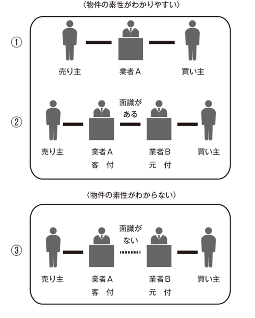あなたに物件を紹介してくれる不動産会社が下記図表の①のように、直接売り主から売却の依頼を受けている関係であれば、物件の詳細まで確認できる可能性が高くなります。