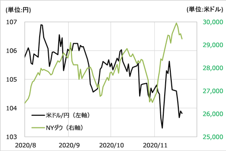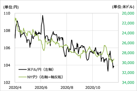 この米ドル/円に米国株、NYダウを軸反転させて重ねてみると、細かい上下動はともかく、3月の「コロナ・ショック」の株暴落が一段落した後からの株高トレンドと米ドル/円の下落トレンドがほぼ連動してきたことがわかるでしょう(図表2参照)。