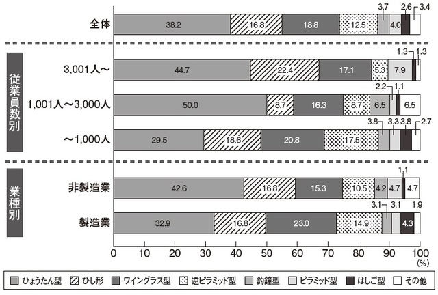 図表2は、自社が図表1のどれに当てはまるか、日本企業354社が回答した結果の集計です。7つの類型の内、高年齢層の比率が高いのは、ひょうたん型・ワイングラス型・逆ピラミッド型の3つで、これら3つの合計が69.5%を占めており、約7割の日本企業は高年齢層の比率が高い状況にあると言えます。会社の人員規模や業態による大きな違いは見られないため、これは多くの日本企業に共通する傾向と言えるでしょう。