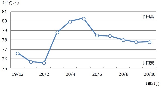 以上より、日本円は現在、対主要通貨で「強くもなく弱くもない」立ち位置にあるといえます。しかし、相対的な通貨の実力を測る実質実効為替レートでは、昨年末以降、日本円の強さが幾分みられます(図表2)。実質実効為替レートは、日本円と全対象通貨との為替レートを貿易額などでウエイト付けし、それぞれの物価変動分を調整して算出します。そのため、一般には市場のリスク選好度合いの判断ではなく、貿易収支の分析に用いられます。
