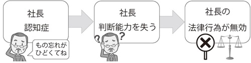 判断能力がない者(「意思無能力者」といいます)の法律行為は「無効」となります。したがって、認知症が進み、判断能力を失った社長の法律行為は、はじめから当然に効力がないものとして扱われます。