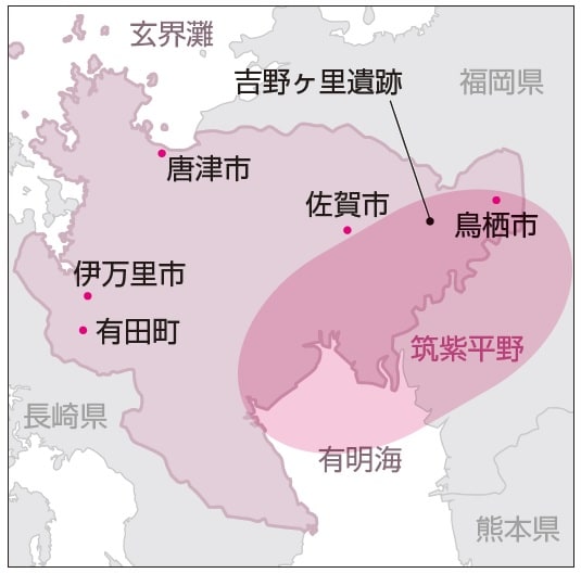 筑紫平野は、福岡県と佐賀県にまたがっていますし、有明海も佐賀県だけに面しているわけではないので、佐賀だけでこれが有名、というものは地理ではありません。歴史好きな人であれば、弥生(やよい)時代にできたと言われる吉野ヶ里(よしのがり)遺跡が出てくるかもしれませんね。