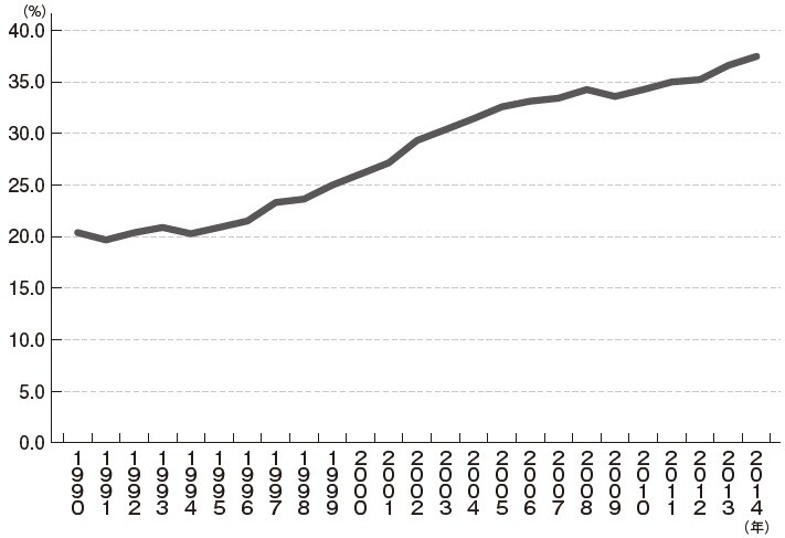 ちょうどこの頃に日本に定着した言葉が「フリーター」です。図表2をご覧いただければ分かる通り、バブル崩壊以降、日本企業における非正規雇用者の割合は上がる一方です。新卒時の就職活動で安定的な収入を得られる仕事に就けず、その後、挽回もできず、家庭を持つこと自体が生活リスクとして若者に捉えられるようになってしまいました。中高年の引きこもりや8050問題(80歳代の親が50歳代の子供の生活を支えなければならない状況)の一因にもなっています。