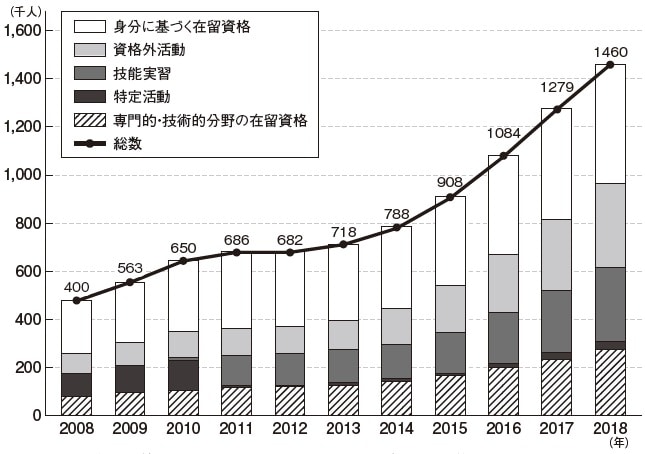 ただし、この約283万人(令和元年6月現在)の在留外国人全員が日本で仕事に就いている訳ではありません。平成30年(2018年)時点の外国人労働者数は、図表6の通り、約146万人です。