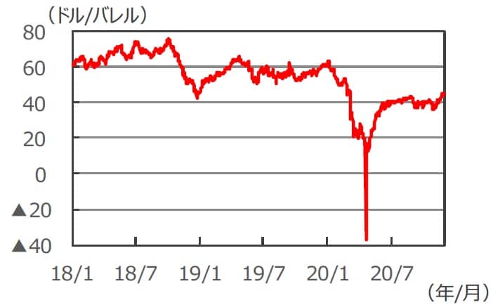 ■その後、各国で経済活動再開の動きが始まったことなどからWTIは上昇に転じ、6月以降は40米ドルを挟んだ動きとなりました。足元、新型コロナワクチンに対する期待から46米ドル弱となっており、ここまでの年間騰落率は▲25%です。