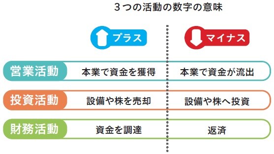 ●動きは、営業活動、投資活動、財務活動に分けて把握する。
