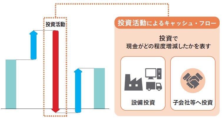 ●投資C/Fは、固定資産や株式などの投資によってどれくらいの現金預金が動いたかを示す。