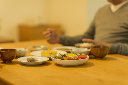 六時起床。私は一番先に台所に入った。結婚祝いに友達からもらった、純白のレースつきのエプロンをかけ、朝食のしたくに取りかかった。サラダとハムエッグ・紅鮭・ほうれん草のお浸し・漬け物・納豆・味付のりとご飯とみそ汁が今朝のメニューだ。