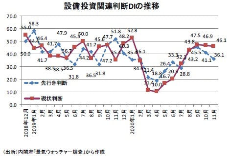 ●景気ウォッチャー調査の設備投資関連・DIの今年の動きをみよう。20年1月の現状判断DIが52.8(同9人)と18年12月分の55.0以来の50超となった。当時の設備投資関連・現状判断DIからは底堅さが感じ取れるようになってきていた。しかし、新型コロナウイルスの影響で現状判断DIは4月10.0(同5人)へと急落した。4月を底にその後、緊急事態宣言解除もあり、9月は47.5(同10人)と持ち直してきていたが、10月は46.8(同8人)、11月は46.1(同13人)に低下した。11月のコメントには「客先の業界で年末に向けて多少の設備投資があると思ったが、新型コロナウイルスの影響で余り良くならず、低迷状態が続いている。」(東海、電気機械器具製造業〔経営者〕)というものがあった。