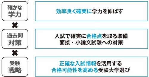志望大学の出題傾向から求められる学力を意識して効率良く学力を伸ばし、学科試験・面接・小論文の過去問を使って合格点を目指します。正確な入試情報も活用して、さらに合格の可能性を高めましょう(図表6)。