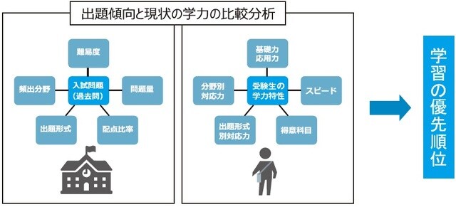 志望大学の科目ごとの「配点比率」「難易度」「問題量」「出題形式」「頻出分野」を分析し、自分自身の現在の学力状況と比較することで課題点を捉え、学習の優先順位を考え効率良く学習します(図表7)。