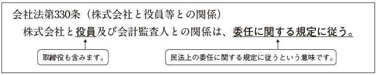 会社と取締役との関係は、委任に関する規定に従うことになります。つまり、会社と取締役は、委任関係にあるのです。そのことが、会社法の条文に定められていますので、確認してみましょう(図表6)。ここでいう役員とは、取締役、会計参与及び監査役のことをいいます。会社法上、会社と役員との関係は、民法の委任に関する規定に従うとしています。