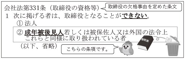 この改正会社法には、取締役等(取締役、監査役、執行役及び清算人)の欠格条項を削除する項目が盛り込まれており、取締役の欠格事由を定めた次の条項は削除されます(図表5)。