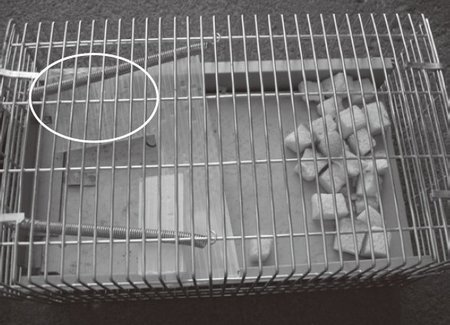 回収する前の様子を再現した(写真1)。中上、中下の捕獲具が、引き出されていた。その隣りが回収した6台の写真である(写真2)。手前の3台が下で、奥が上に乗せてあった3台。右上の1台は入口が開いていて中のパンが食べられていた。残り5台は入口が閉まっているのに捕獲されていない。5台のうち、左上、中上、右下の3台には、毛が多く落ちているのが確認できた。