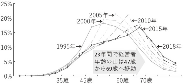 中小企業庁によると、最も多い経営者の年齢が、2018年には69歳となっており(図表1)、2025年までに70歳(平均引退年齢)を超える中小企業・個人事業の経営者の数が約245万人(日本企業全体の約6割)になると推測しています。