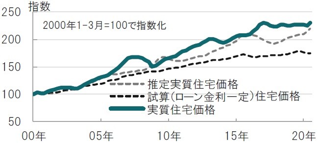 なお、差異の部分は住宅価格の過大評価分と指摘しています。下の黒の点線は推定当初から金利が変化しなかったと仮定した場合の住宅価格の試算値です。