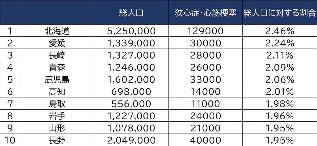 次に「狭心症・心筋梗塞」。トップは「北海道」で総人口に対して通院する人は2.46%。「愛媛県」2.24%、「長崎県」2.11%、「青森県」2.09%、「鹿児島県」2.06%と続きます。一方で最も低いのが「山梨県」で1.36%。「広島県」「愛知県」「新潟県」「沖縄県」と続きます(図表2)。