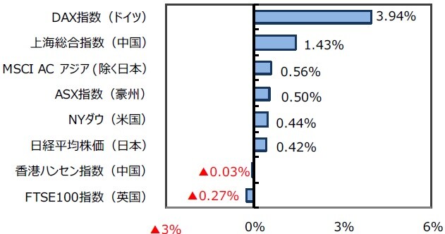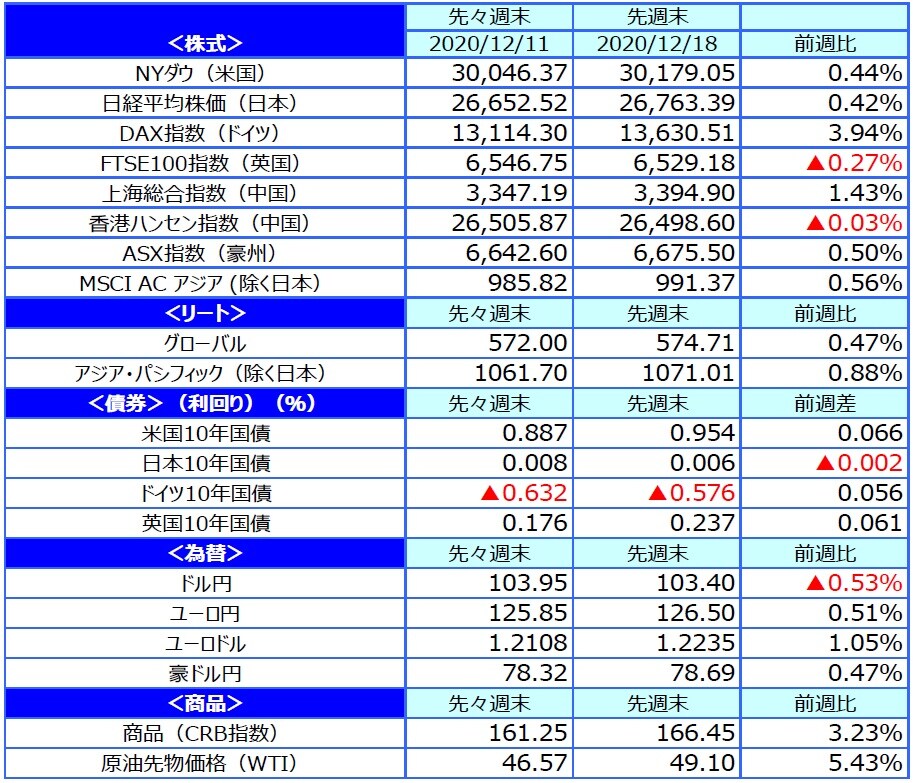 主要株式市場は概ね上昇しました。米国株式市場は、新型コロナの感染拡大が続く中、ニューヨーク市長が再びロックダウンを導入する可能性に言及しましたが、米連邦公開市場委員会(FOMC)で金融緩和策の長期化が示されたことや追加経済対策法案の成立見通しが一段と強まったことなどが支援となり上昇しました。週間ではNYダウは0.44%上昇しました。日本株式市場は、日銀短観の改善が好感されたことや、FOMCで金融緩和の継続姿勢を確認できたことも安心材料となり、日経平均株価は週間では0.42%上昇しました。欧州株式市場は、英国とEUが通商協議を継続すると決めたことや、米や英などでのコロナワクチンの接種開始などを好感してDAX指数は3.94%上昇しました。FTSE100指数はポンド高などが嫌気されて0.27%下落しました。中国株式市場は、11月の主要経済指標が概ね堅調だった他、開催された中央経済工作会議で内需拡大の方針に沿った施策が打ち出されるとの期待で、上海総合指数は1.43%上昇しました。香港ハンセン指数はほぼ横ばいとなりました。