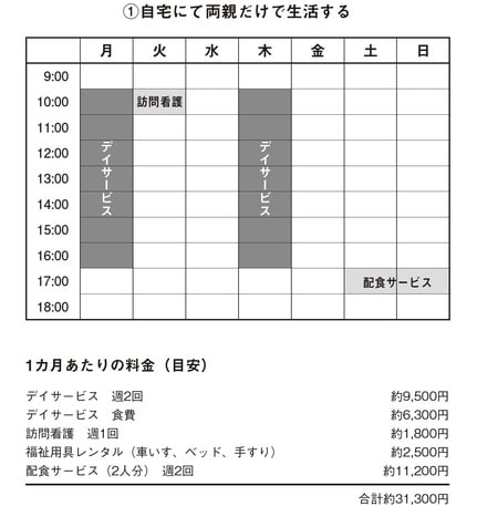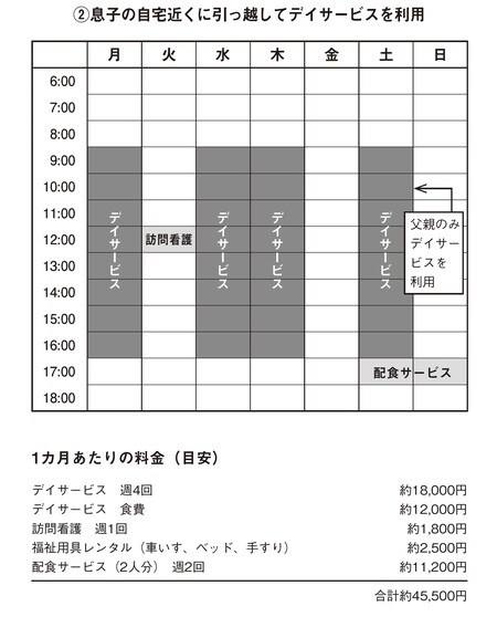 その上で父親がデイサービスを利用します。この場合、父親はデイサービスを週4回利用、訪問看護は週1回利用することにします。デイサービスの月額利用料金は1万8000円程度、デイサービスの食費が1万円程度、訪問看護と福祉用具のレンタルを含め、介護費用は月額4万5000円ほどになります。