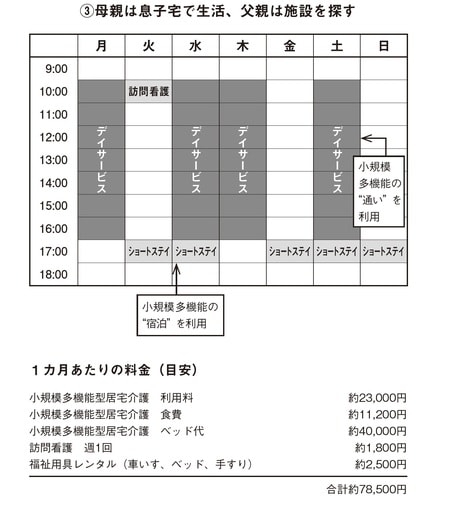 特別養護老人ホームはすぐに入所できるとはかぎらないので、いったん両親ともに息子の家に引っ越し、その上で父親は小規模多機能型居宅介護のショートステイを利用しながら施設を探します。